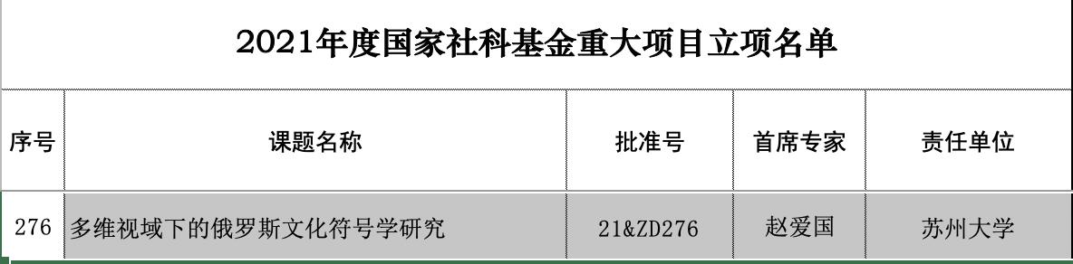 直播 赵爱国教授的“多维视域下的俄罗斯文化符号学研究”荣获2021年度国家社科基金重大项目立项。赵爱国教授作为俄语语言文学的学科带头人,长期以来专注于俄罗斯语言、文化与符号学研究,先后获得5项国家社科基金项目(包括重大项目、重点项目、一般项目、优秀成果文库项目、后期资助项目),2项省部级项目,发表学术论文100余篇,出版学术专著7部,主编学术著作2部,教材2部,汉译学术著作及小说9部/篇。学术成果曾两次荣获江苏省哲学社会科学优秀成果2等奖,先后获得苏州大学教学名师、优秀共产党员、高尚师德奖等荣誉称号。
