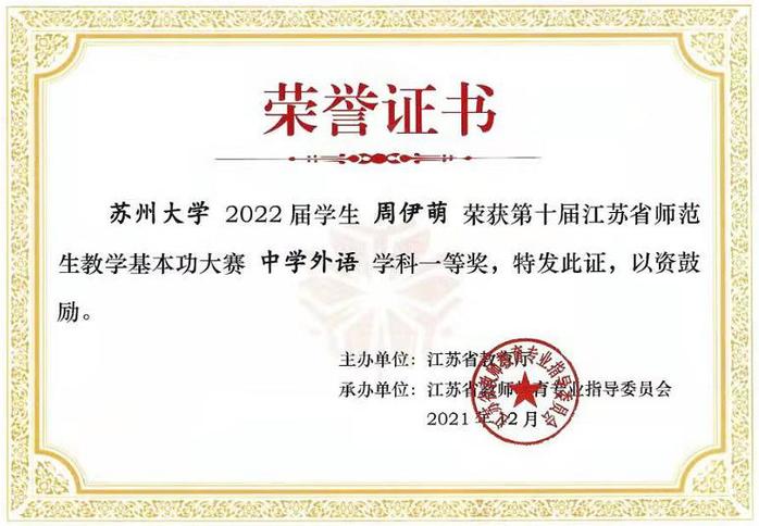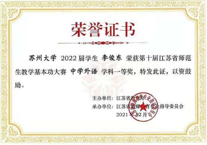 2022年1月2日至4日,由江苏省教育厅主办、江苏省教师教育专业指导委员会承办的第十届江苏省师范生教学基本功大赛在淮阴师范学院举行,直播 18级英语(师范)专业本科生周伊萌、李俊东获中学外语组一等奖。