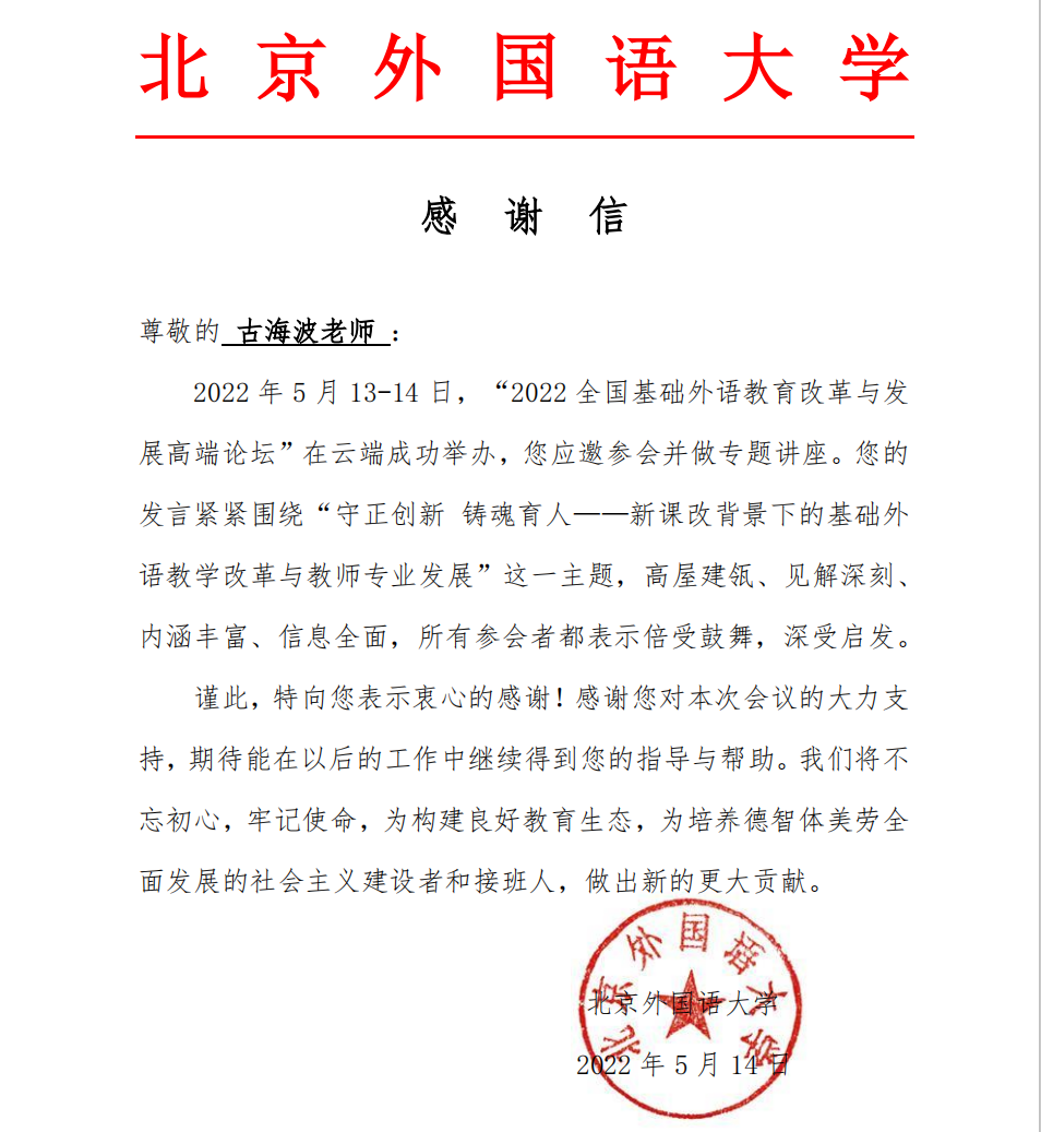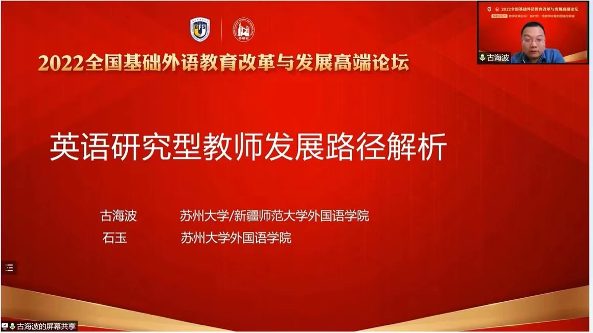 2022年5月13日,由北京外国语大学主办、外语教学与研究出版社承办的“2022全国基础外语教育改革与发展高端论坛”开幕。13日下午,直播 古海波副教授 (新疆师范大学外国语学院挂职副院长)和21级研究生石玉受邀参加分论坛六:“新时代一线教师发展的困境与突破”,并发表题为“英语研究型教师发展路径解析”的学术报告。论坛全程线上直播,吸引了约1.87万人次观看。北京外国语大学为此发来感谢信。